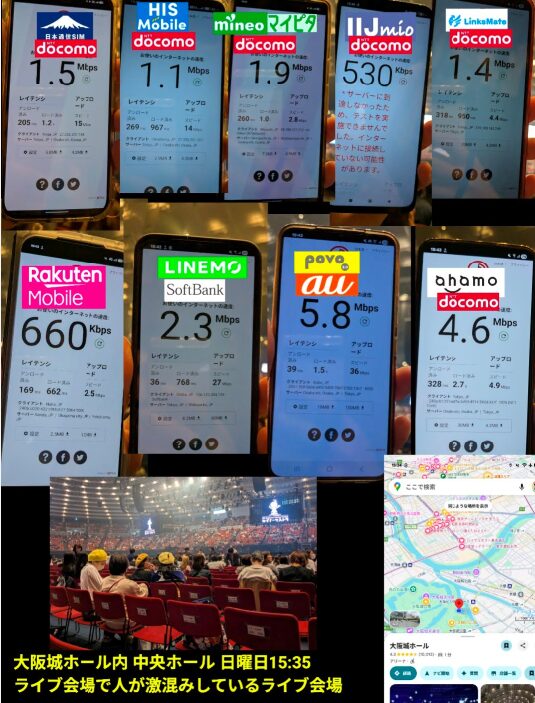 またスマホの通信速度で重要なのは、最高速度ではなく、「ライブ会場などの極限状態」でも最低限つながるという、最低速度こそが重要であることも分かりました。