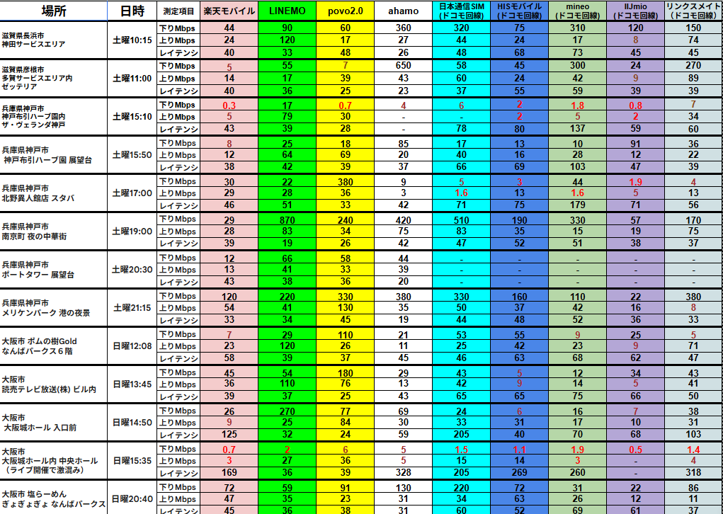 今回検証した場所は、高い所、人が多い場所、室内といった、携帯会社の電波が悪くなりやすい場面が多いため、携帯会社によっては普段使いに支障が出る遅さになりがちです。