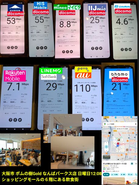 ドコモ系は極端に速かったが、他の携帯会社も下り5Mbps以上、ネット閲覧や動画視聴には全く困らない安定した速度が出ていた。