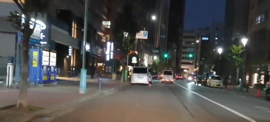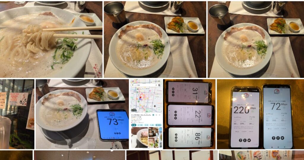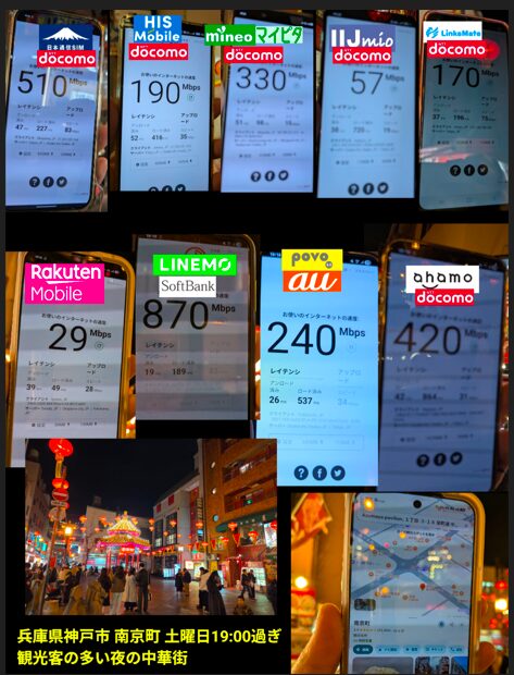 土曜日の夜のため観光客も多く混雑していましたが、街中のため、各社とも基地局の整備もバッチリ、全社とも下り速度もレイテンシもともに快適な通信環境でした。