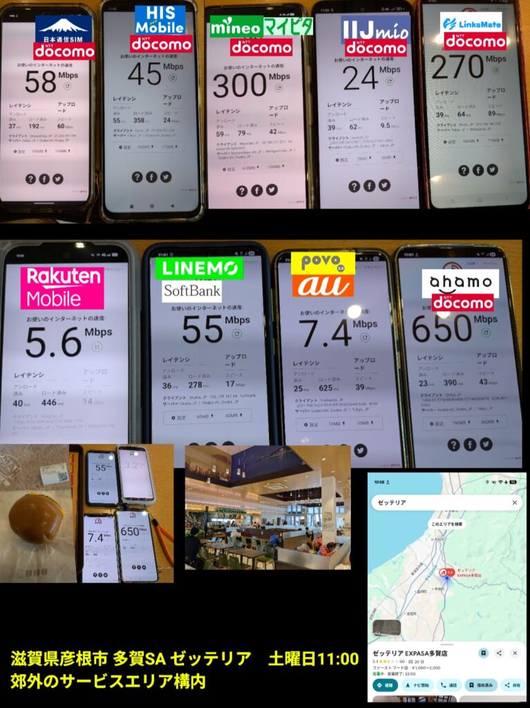 測定ポイント1、滋賀県の神田サービスエリアで土曜朝10時に速度測定。