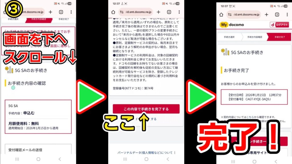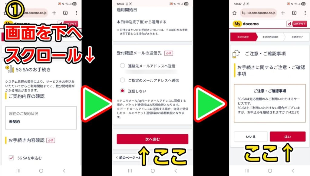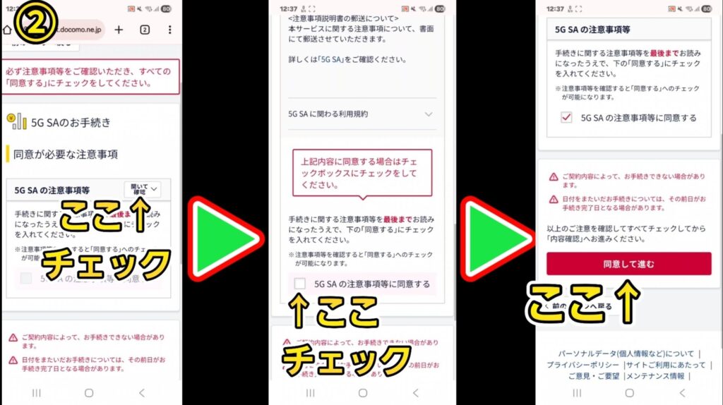 最後に、5GSAオプションを申込します。こちらのサイトへ進み、以下の画像の通り進んでいけばOKです。