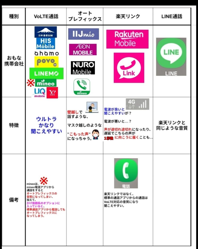 VoLTE対応の携帯会社は、大手3キャリア並みの音質で電話でき、非常に聞き取りやすく快適に通話ができます。