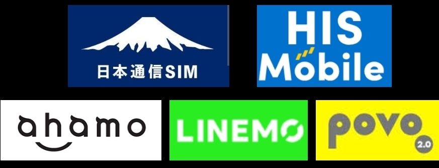 日本通信SIM、HISモバイル、ahamo、LINEMO、povo2.0などがあり、この中では日本通信SIMとHISモバイルが料金も安くお勧めです。