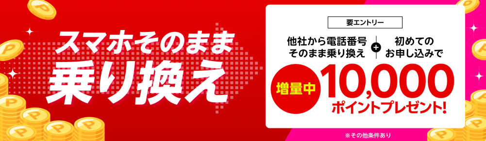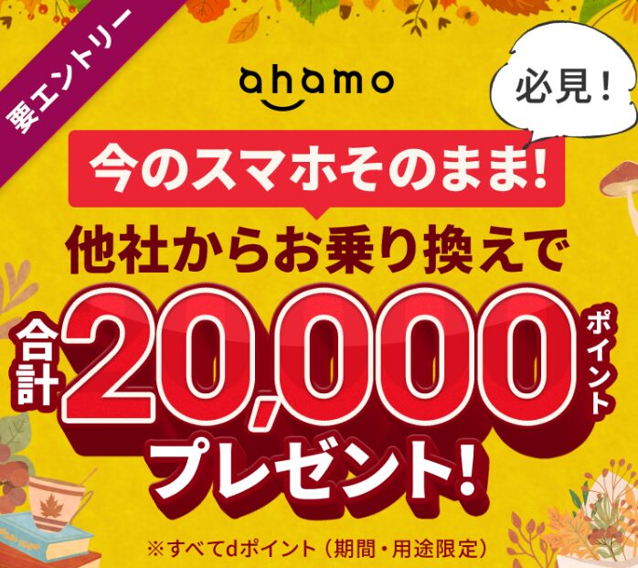 今なら他社からahamoへ乗り換えると、dポイントが合計20,000pが進呈されます。(事前エントリー必須)