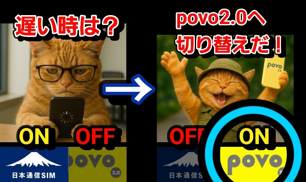 メインで使っている回線の速度が遅いときに、一時的にpovo2.0を課金して乗り切ることができます!