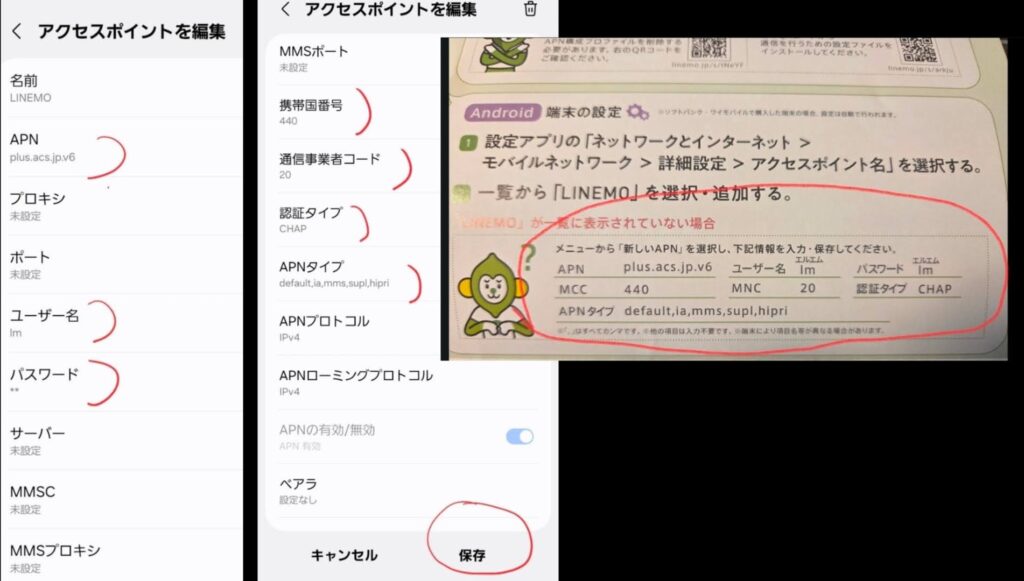 多くのAndroid機種では、LINEMOの電波でネットを使えるようにする設定(APN設定)が必要なので解説します。Galaxyを例に解説します。