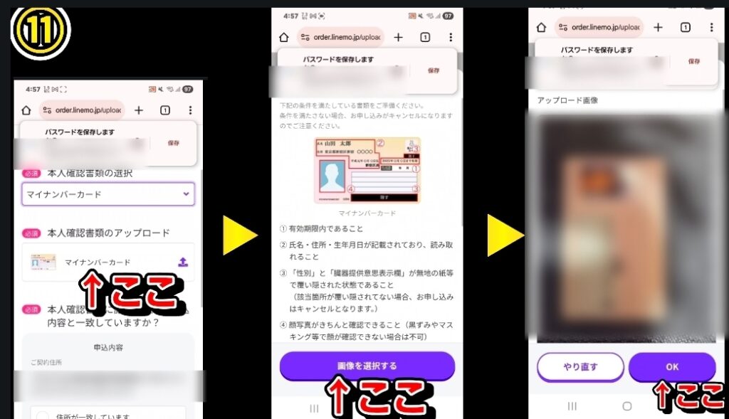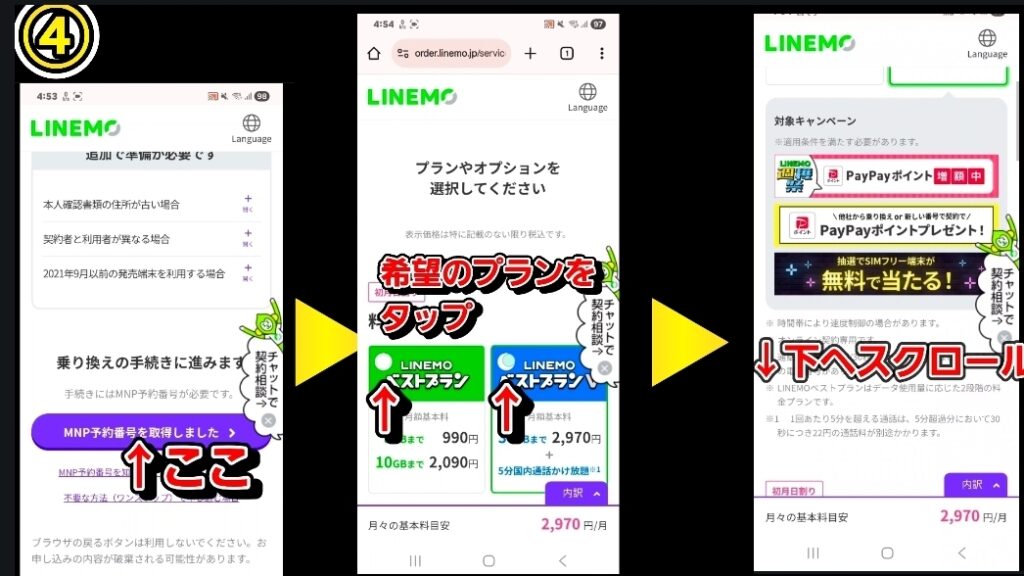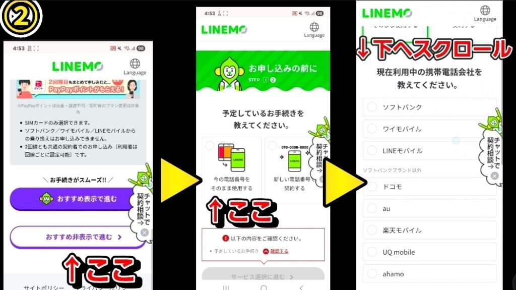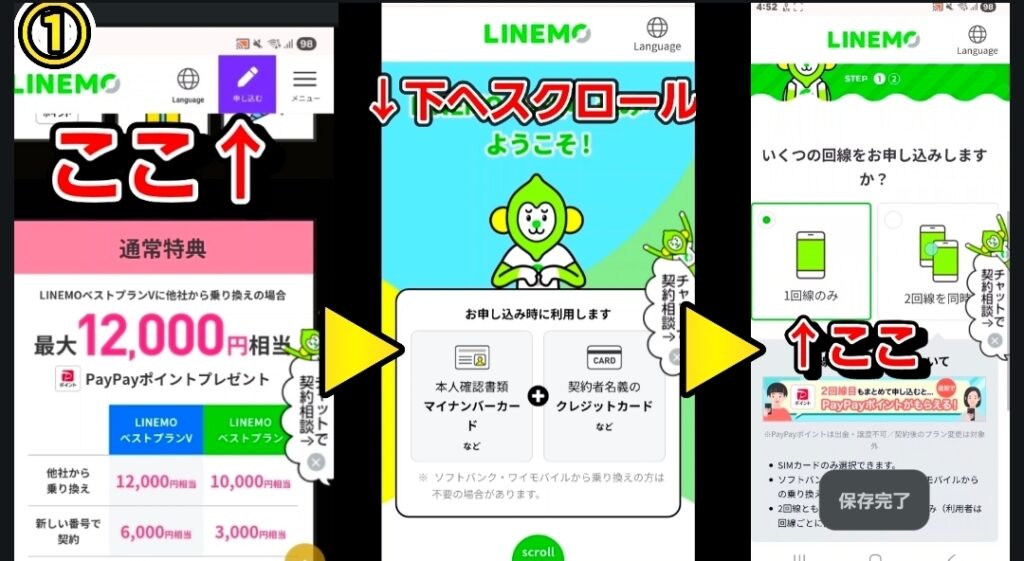 こちらよりLINEMO公式サイトへ進み、画像の通りすすめます。