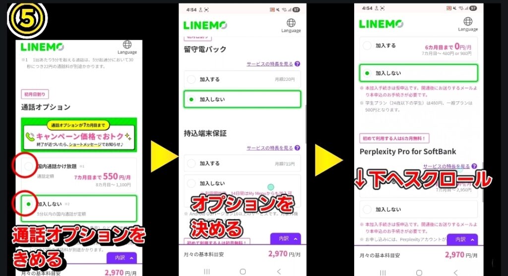 かけ放題オプションや、その他オプションに加入するか決めます、あとで申し込みもできるので、いまはとりあえずナシで大丈夫です。