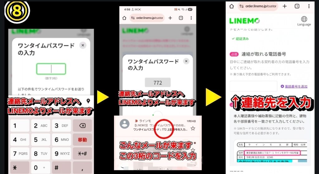連絡先メールアドレスに、6桁のワンタイムパスコードが送られてきますので、入力します。
