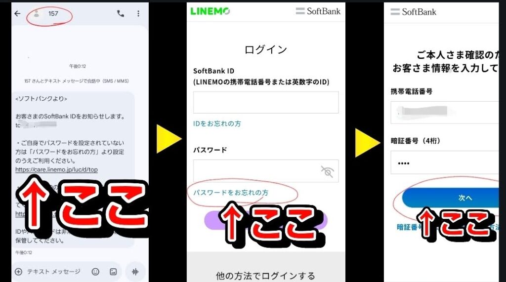 ソフトバンク(157)からショートメールが届いているので開き、画像の通り進めてください。