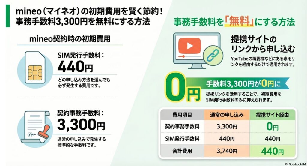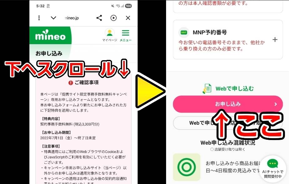 公式サイトから手続きを進めます。提携サイトである筆者のYouTube概要欄からmineo申込すれば契約事務手数料3,300円がかからなくなりますので、こちらからの申込手順を解説します。