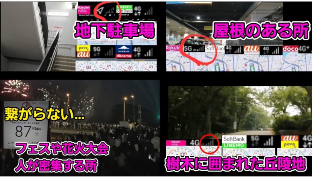 ドコモauソフトバンクの電波と比べると、屋内や人混みでさらに弱いので、「いかに電波が悪い場所へ近づかないかがカギ」で、以下のような場所では電波が悪くなることがあります。