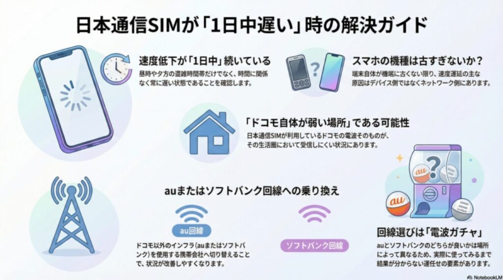 日本通信SIMに変えた後、昼や夕方だけでなく一日を通して通信が遅い時は、ドコモ回線そのものが弱い場所の可能性が高いので、auまたはソフトバンクの電波を使った携帯会社へ乗り換えると解決しやすいです。