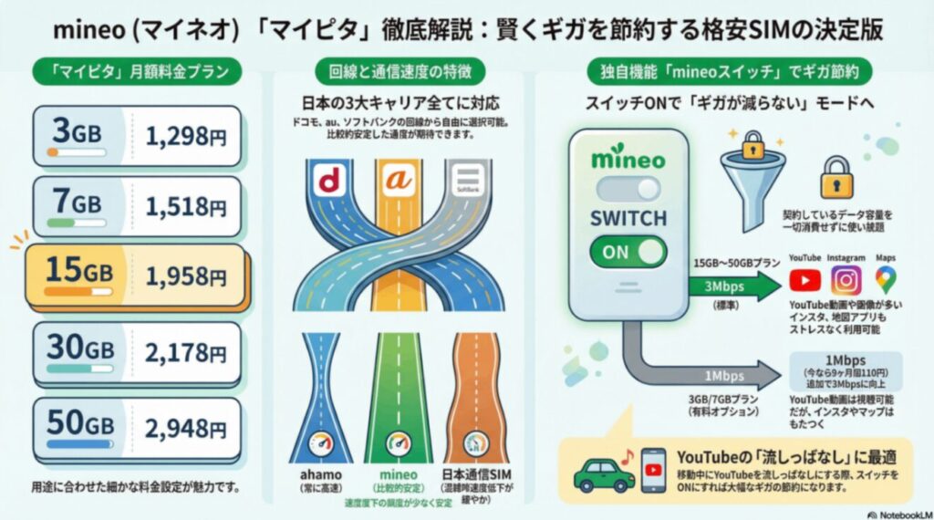 mineoも日本通信SIMと同じく”時間帯によって遅くなる格安SIM”で、低速になるがギガが減らなくなるmineoスイッチが特徴で、ドコモ回線だけでなく、au回線とソフトバンク回線も選べます。