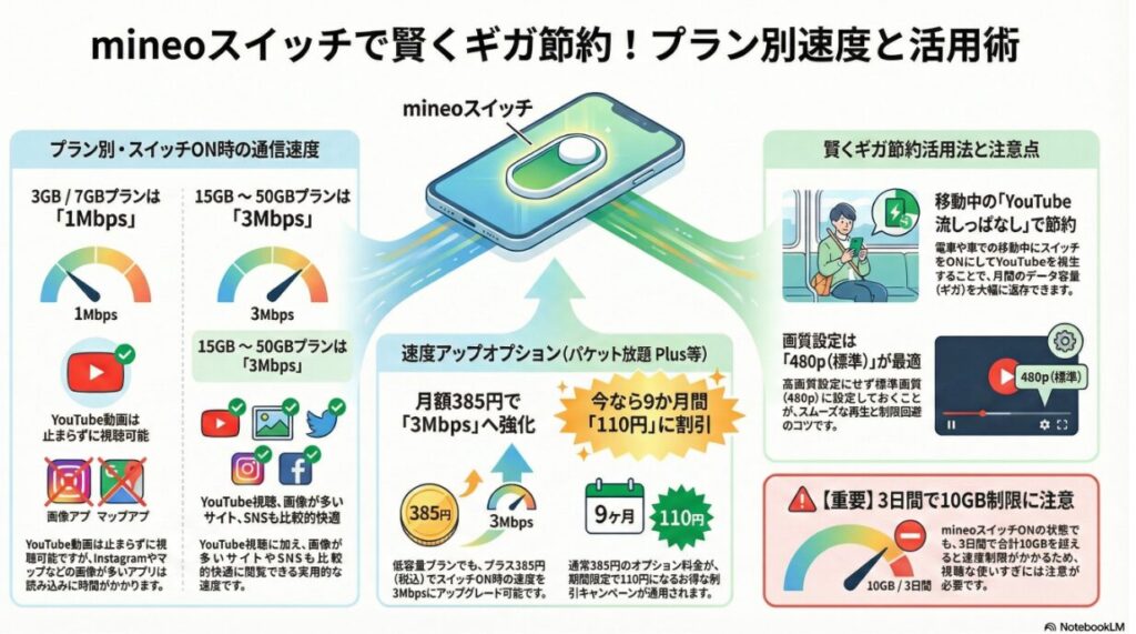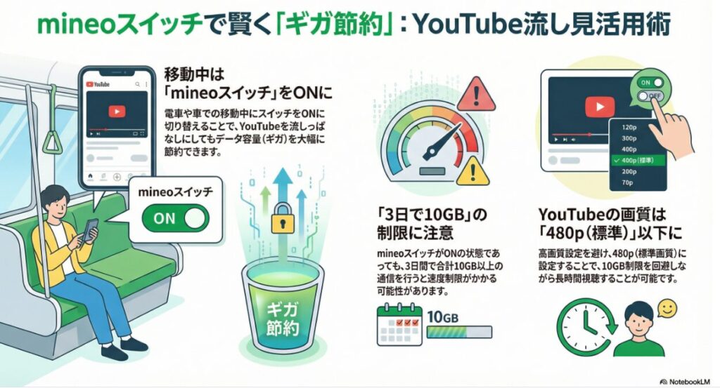 mineoスイッチONのときに3日で10GB使うと○ぬのですが、YouTubeの画質を高画質にしなければ10GB超えることはめったにないです(480pの標準画質なら大丈夫)。