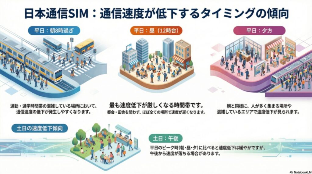 日本通信SIMが遅くなる時間帯は、明確には決められていないが以下の傾向があります。