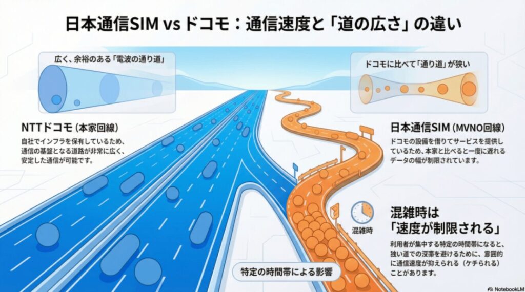 道路で例えると、日本通信SIMの道路はドコモと比べて”電波の通り道”が狭いので、特定の時間帯になると、”意図的に通信速度を絞られ”ます。