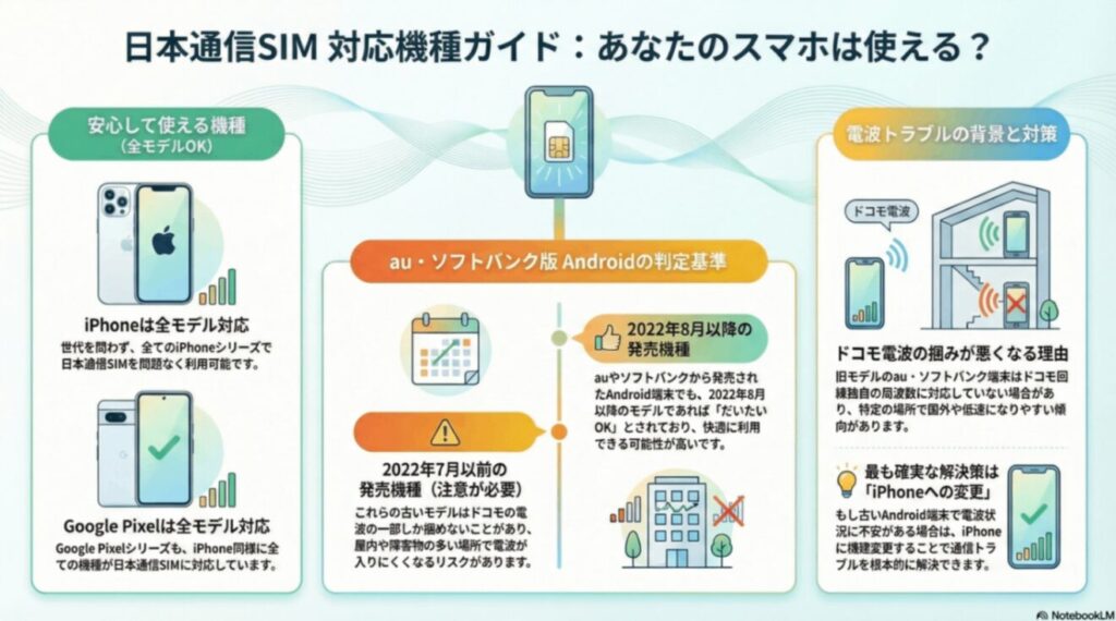iPhoneやGooglePixelなどは日本通信SIMでも問題なく使えます。
