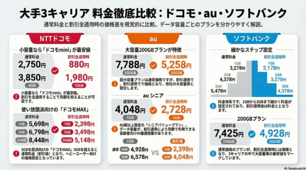 ドコモauソフトバンク料金:比較用にみてみる