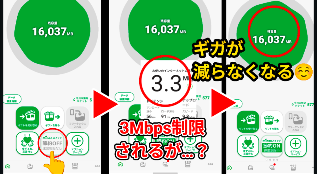mineoならではの独自機能、mineoスイッチをONにしている間は、低速になるのだがギガが減らなくなる。