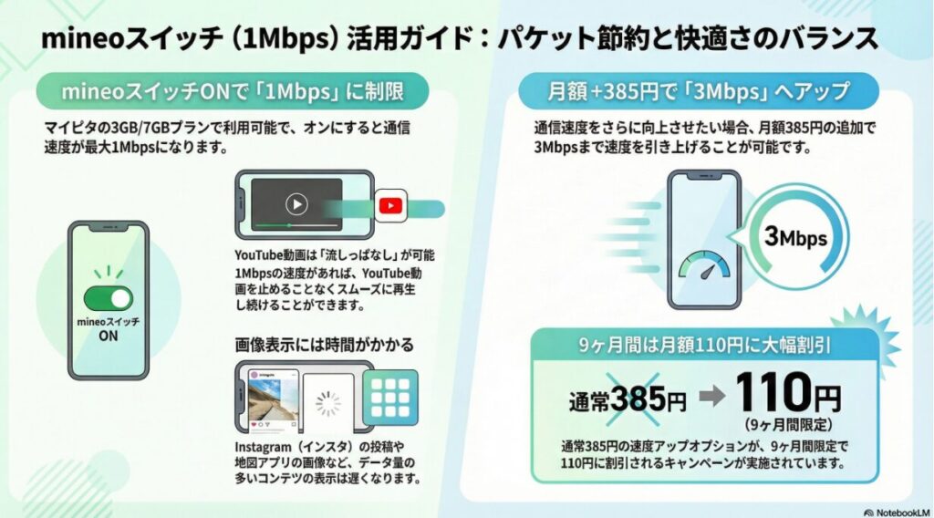 mineoスイッチONのとき、下り1Mbpsに制限され、インスタやマップの画像表示が遅くなりますが、この速度でもYouTube動画は止まらず流しっパが可能な速度です。