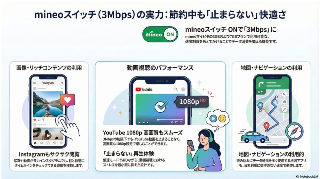 mineoスイッチONのとき、下り3Mbpsに制限されますが、この速度でもYouTube動画を止まらず再生できるだけでなく、インスタやマップなど画像が多いサイトも割と快適に見える速度です。