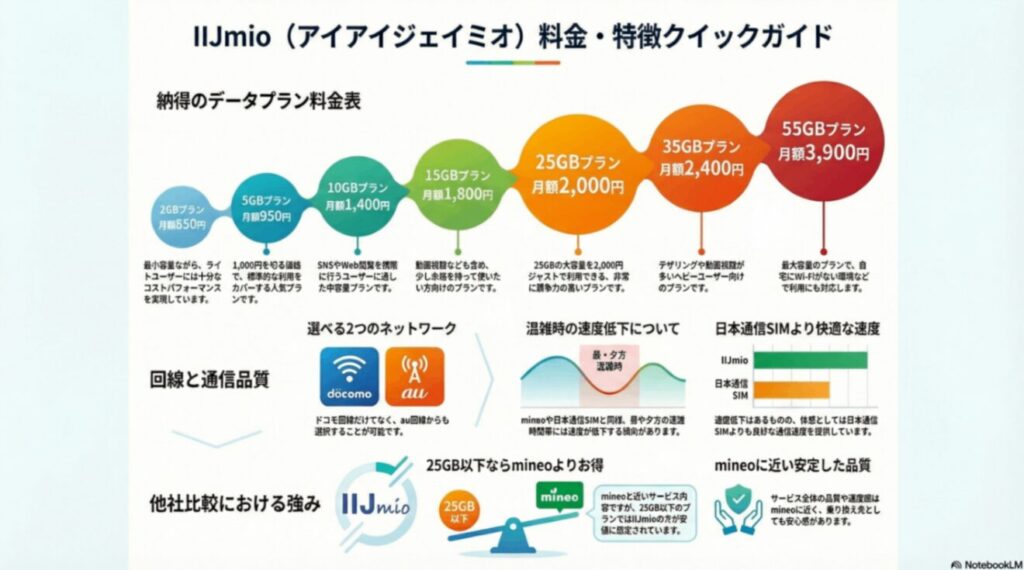 IIJmioなら、mineoと比べて25GB以下の料金帯が安く、au回線にも対応しています。