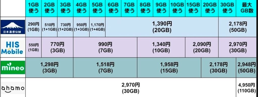 日本通信SIMは、他の格安SIMと比べてもかなり料金が安く、どのギガ数でも最安クラスです。