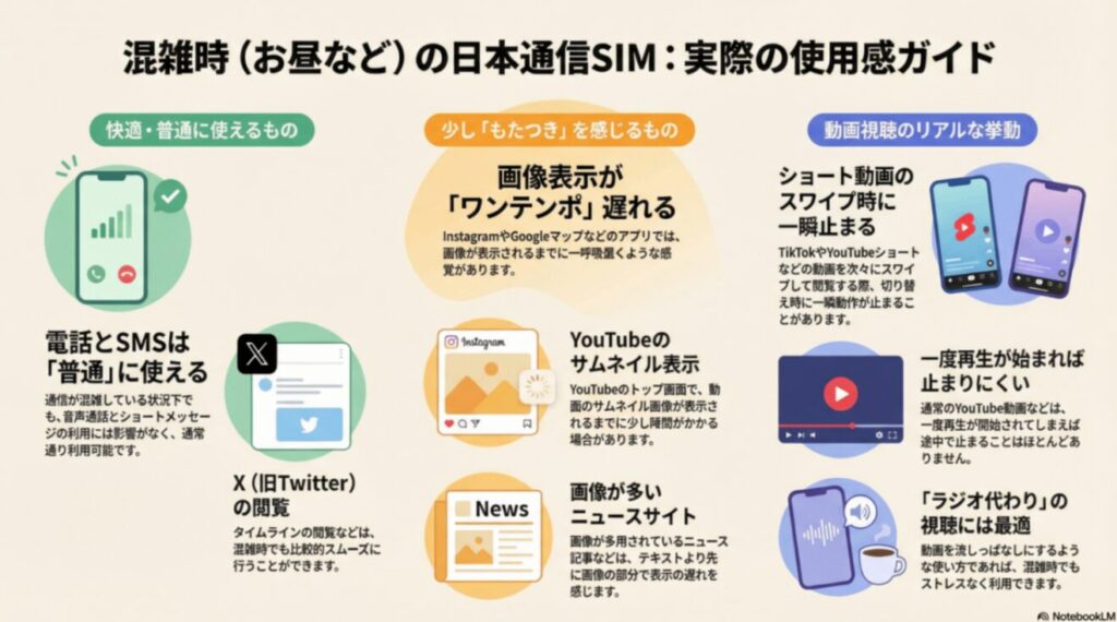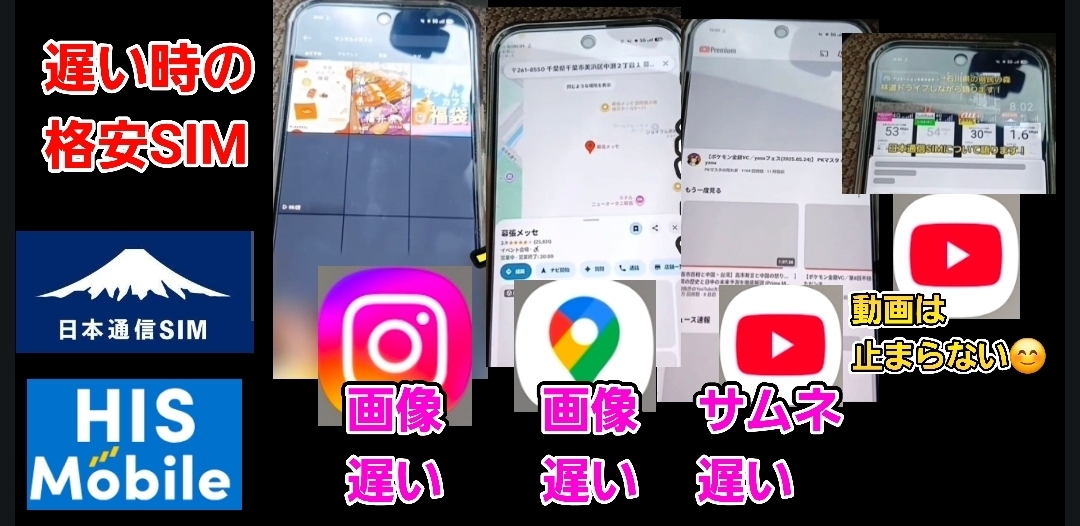 遅い時の日本通信SIMでは主に、動画は止まらず再生できますが、画像の表示が遅くなります。