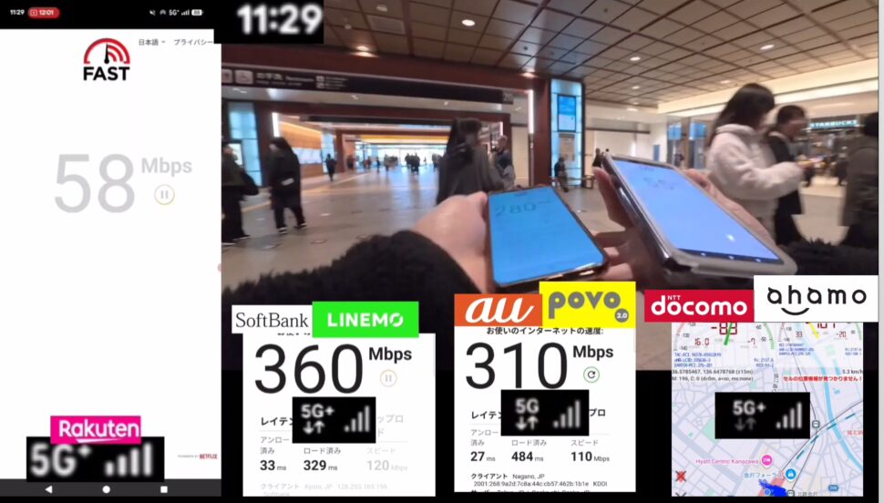 楽天モバイル、ドコモ、au、ソフトバンクの4キャリアで、JR金沢駅構内、金沢市の百貨店内で現地調査した動画です。映像で見るとより分かり易いので興味ある方はどうぞ。