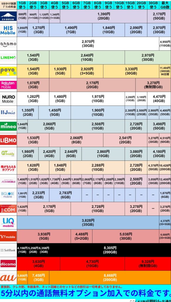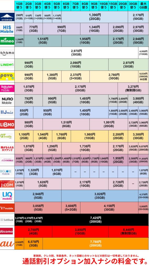 | 3GB 超え | 8,448円 | 7,888円 | 7,238円 | ▲550円 | ▲1,210円 | ▲110円 | ▲110円 |