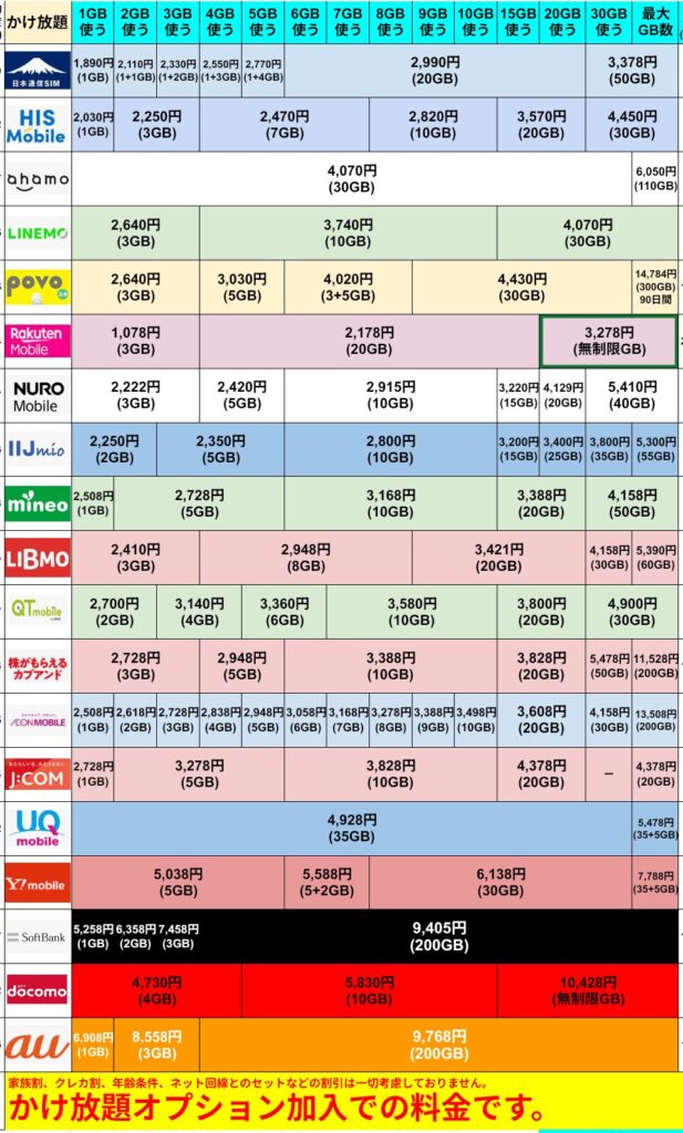 | 楽天モバイル ギガ無制限 | 1,078円 /3GB | 2,178円 /20GB | 3,278円 /GB無制限 |