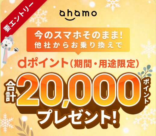 他社からahamoへ乗り換えると、dポイントが合計20,000pが進呈されます。(事前エントリー必須)
