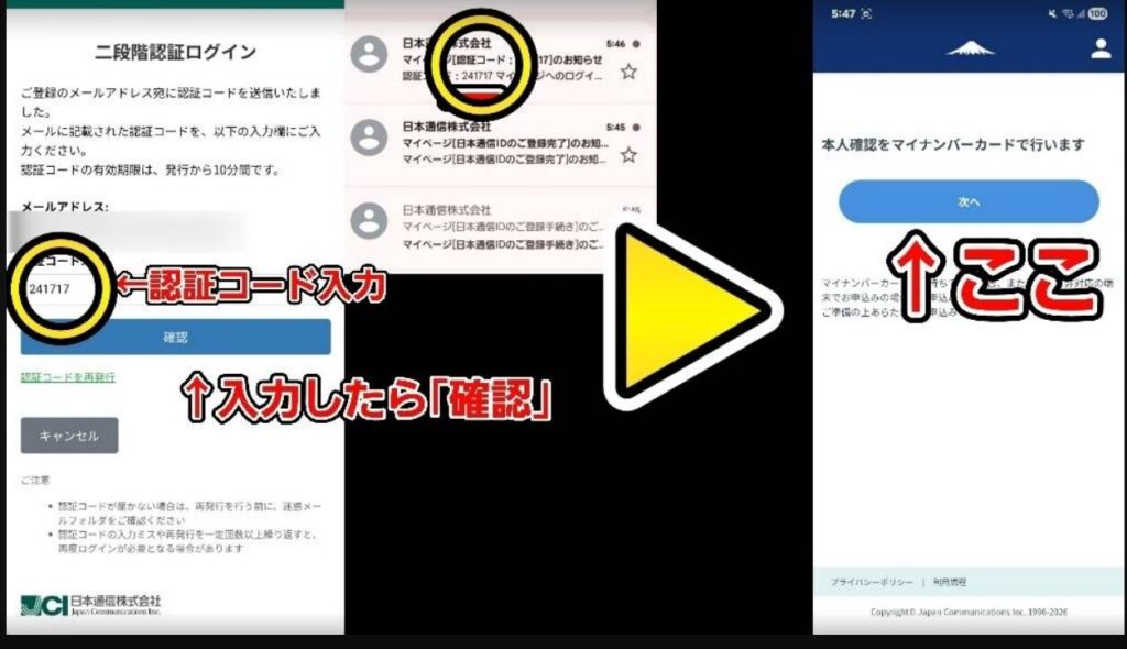 そうすると、日本通信より2段階認証コードが届くので、入力し、確認⇒次へ
