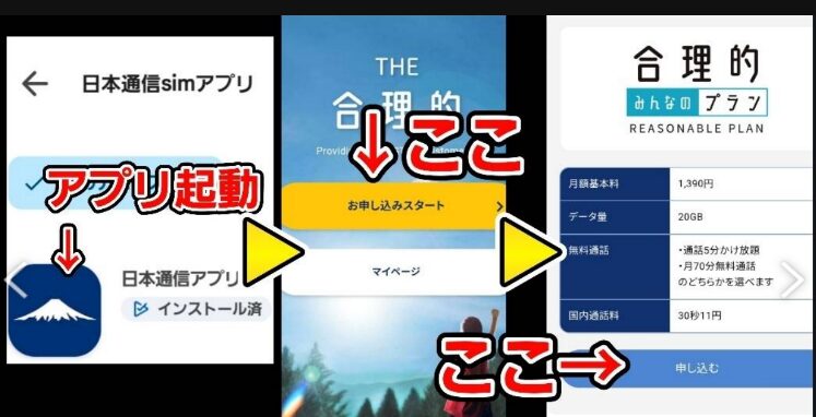この見出しでは、日本通信SIMへの乗り換え時の画面操作を解説します。月額1,390円/20GBのプランで申込していきます。(自身の希望するギガ数で構いません)